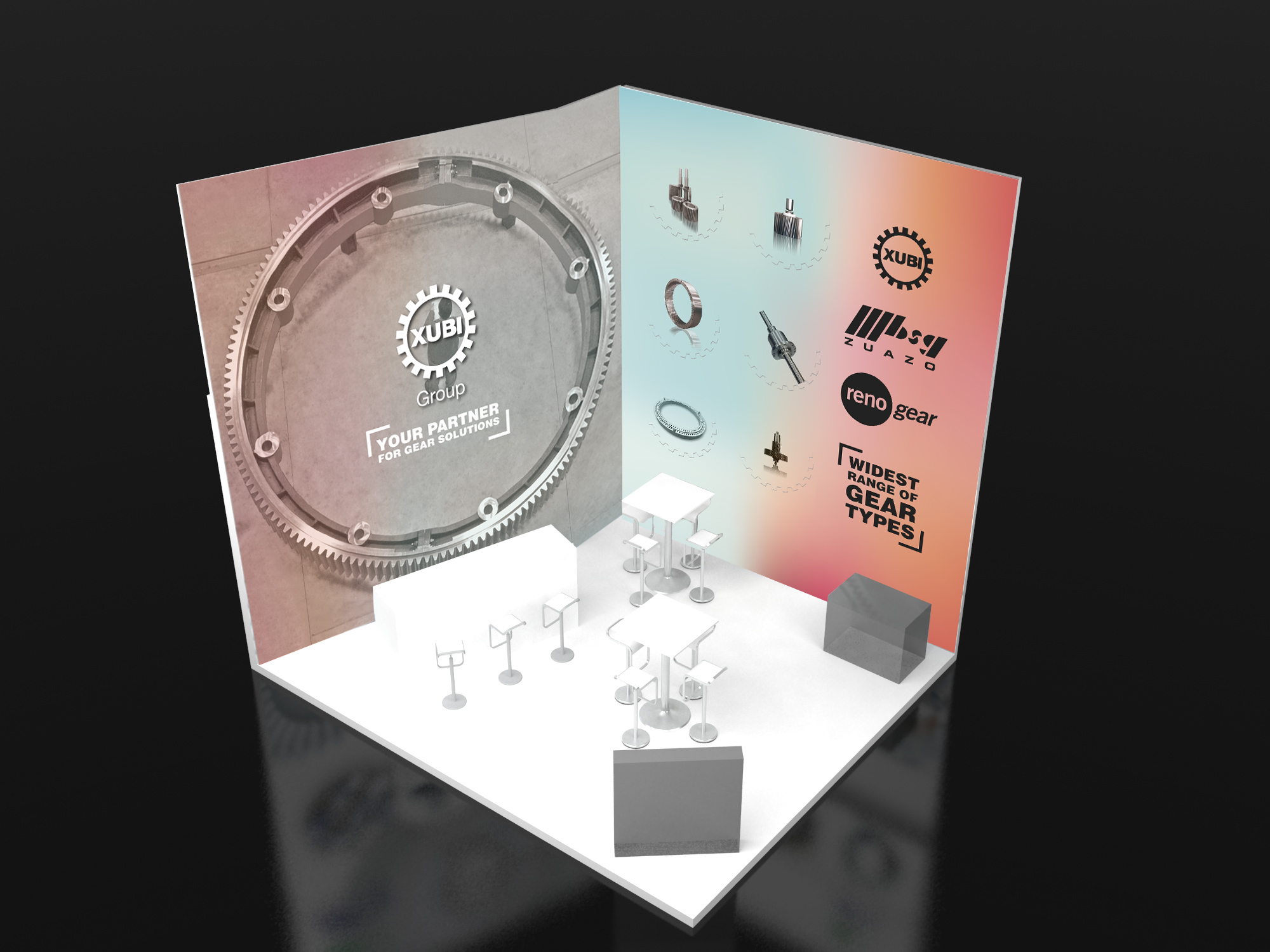 Mostramos varios ejemplos de stands de feria del grupo Xubigroup, formado por las empresas Renogear, Zuazo y Xubi Engranajes.